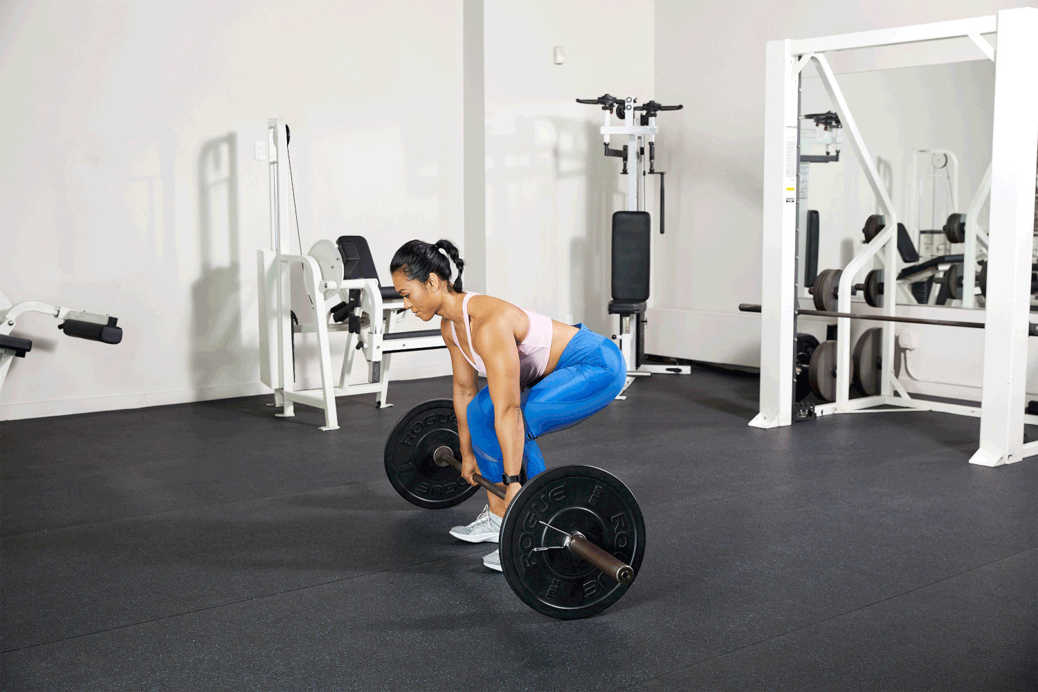 - Bước 3: Đẩy hông ra sau cho đến khi cảm thấy gân kheo căng ra, đảm bảo giữ thẳng cột sống, gồng cơ bụng, ưỡn ngực và bả vai ấn xuống. Đẩy tạ qua bàn chân và cẳng chân; đồng thời, mở rộng đầu gối để chuyển sang tư thế đứng. Khi thanh tạ cao hơn đầu gối, hãy đẩy hông về phía trước để thực hiện chuyển động. Thanh tạ nên di chuyển theo một đường thẳng đứng.
